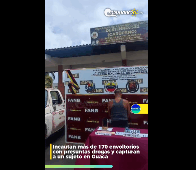 GUACA, VENEZUELA – 27 de agosto– En un operativo contra el narcotráfico, efectivos de la Fuerza Armada Nacional Bolivariana (FANB), adscritos al Comando de Zona de Defensa Integral N° 53 (CZGNB-53) “Sucre”, lograron la incautación de más de 170 envoltorios de presuntas drogas y la captura de un sujeto en la comunidad de Guaca, en el municipio Bermúdez.