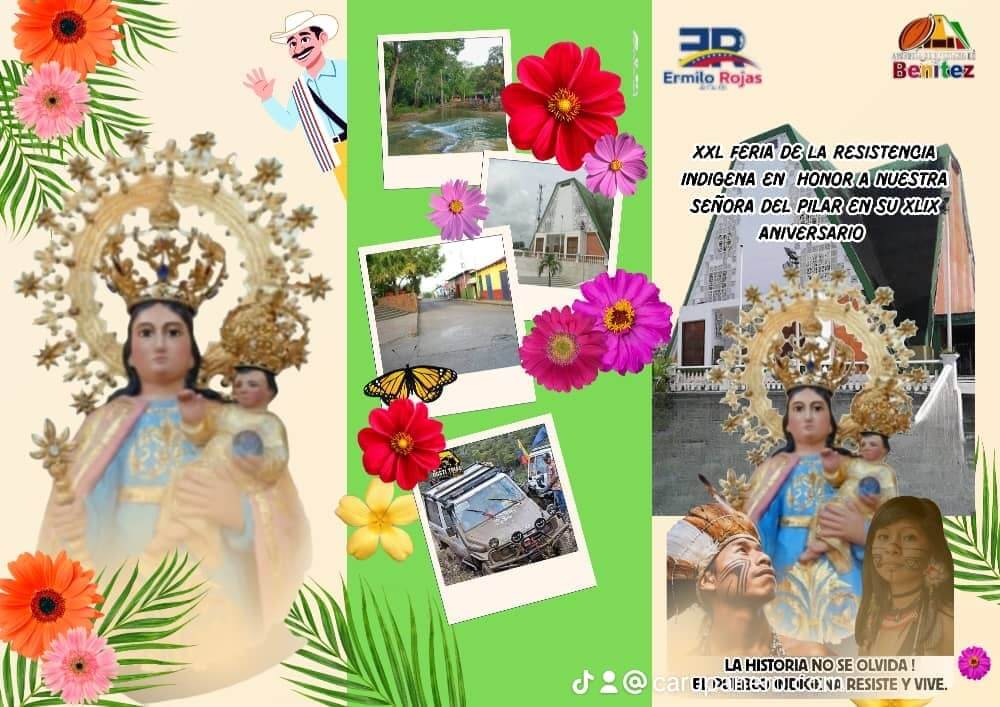 «La historia no se olvida, el pueblo indígena resiste y vive,» es el lema que enmarca esta celebración, destacando la importancia de la memoria y la identidad cultural. Las imágenes de la Virgen del Pilar, adornadas con flores y rodeadas de elementos autóctonos, así como las postales de paisajes locales y la vida cotidiana, refuerzan el sentir de comunidad y tradición entre los Beniteños.